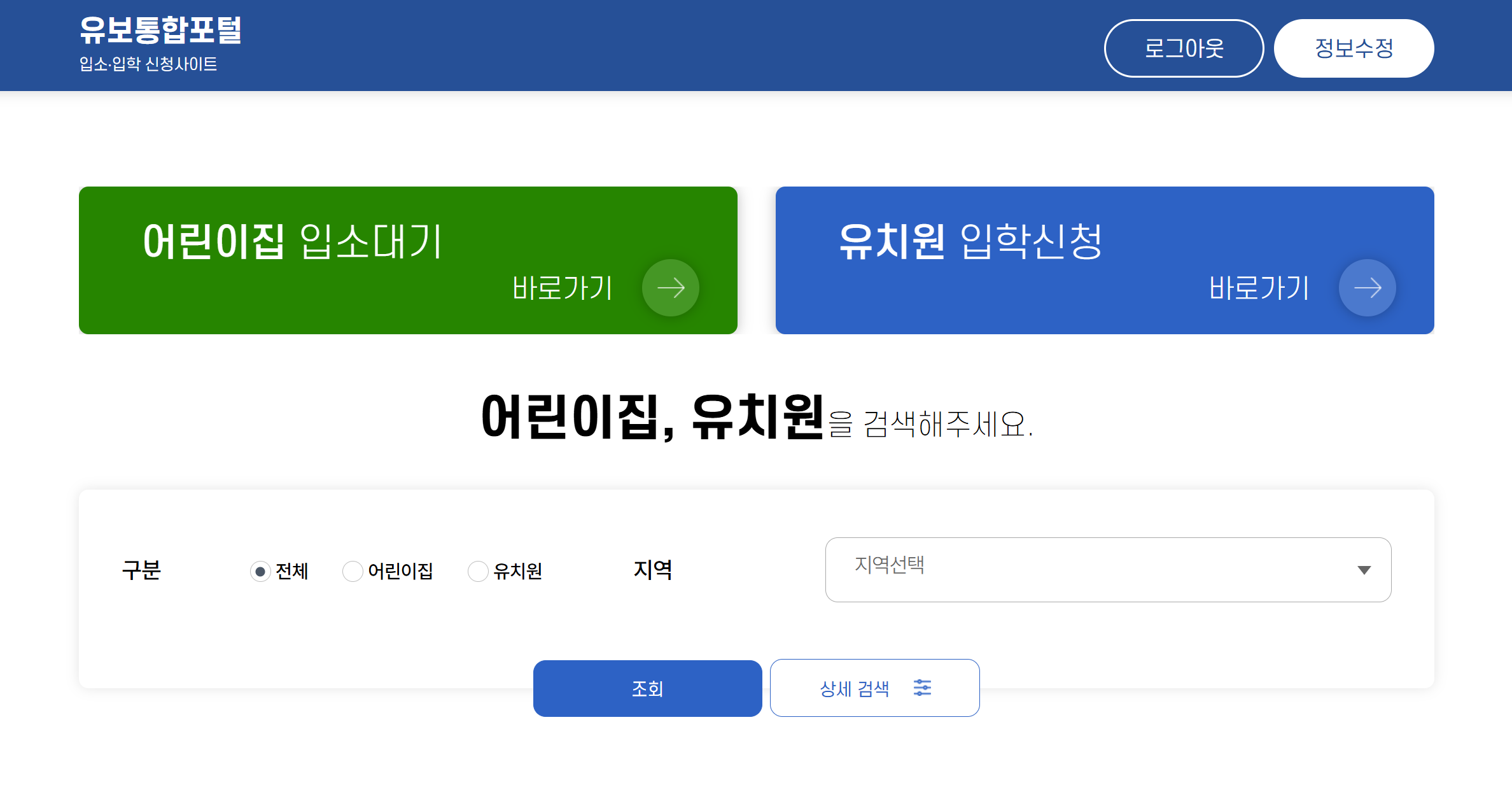 ● 내용 : 한번의 사용자 가입 및 로그인으로 어린이집 입소대기, 유치원 입학신청 가능